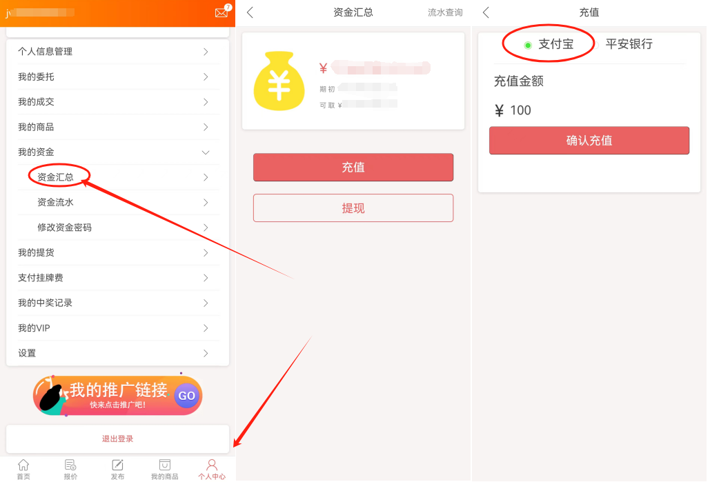 五、充值提现流程: 1、电脑网页版充值提现流程: 1.1、支付宝充值流程(手机APP+网页版): 手机APP支付宝充值:打开个人中心,点击“资金汇总—充值—选择“支付宝”—输入“金额、资金密码”—跳转到支付宝,支付即可。