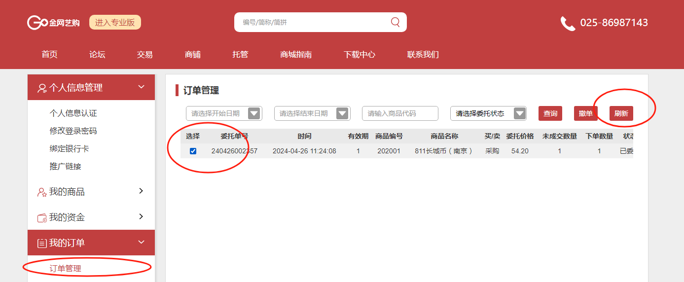 ③撤单:点击个人中心,我的订单—订单管理中,勾选需撤销的订单,点击撤单。