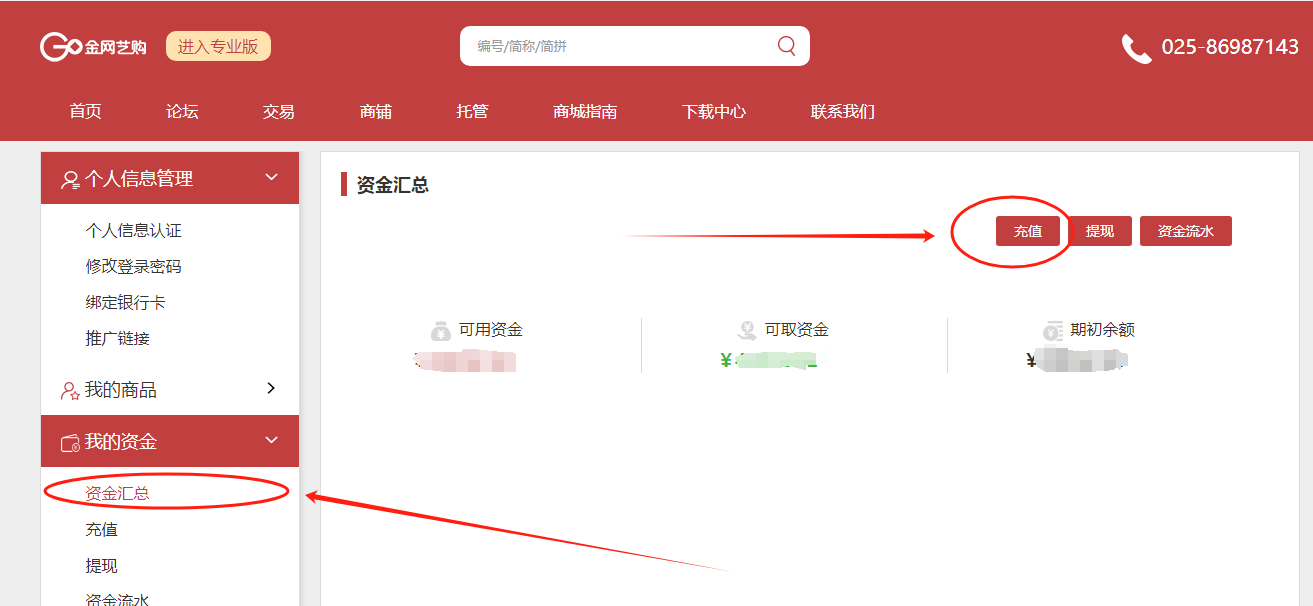 1.2、1.2、银行充值流程(网页版): 第一步:登录金网艺购账户,点击“个人中心—我的资金—充值”,输入“金额、资金密码”点击确定。(注:充值手续费以各通道收费为准)