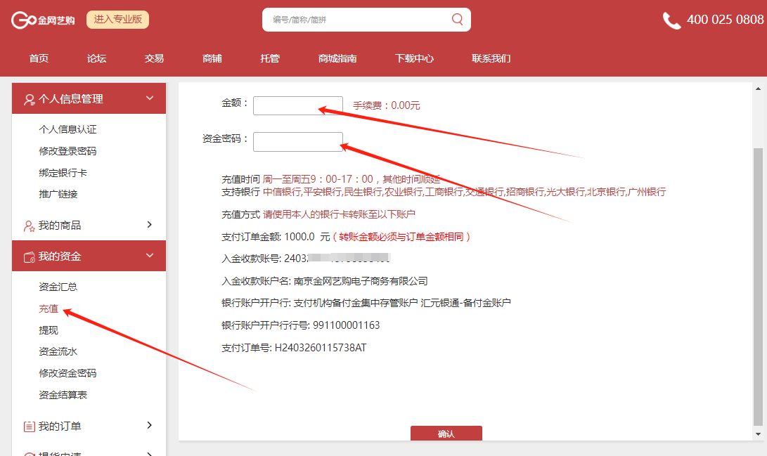 1、 登录金网艺购账户,点击“个人中心—我的资金—充值”,输入“金额、资金密码”点击确定。(注:充值手续费千分之2)