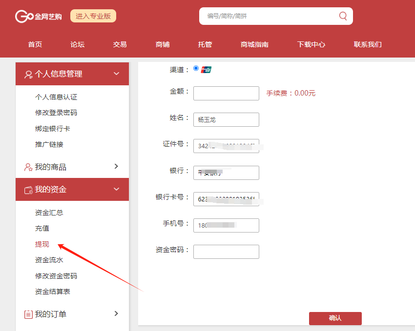 1、 登录金网艺购账户,点击“个人中心—我的资金—提现”,输入提现金额、确认个人银行信息、输入资金密码,点击确定。(注:提现手续费千分之6,资金实时到账)