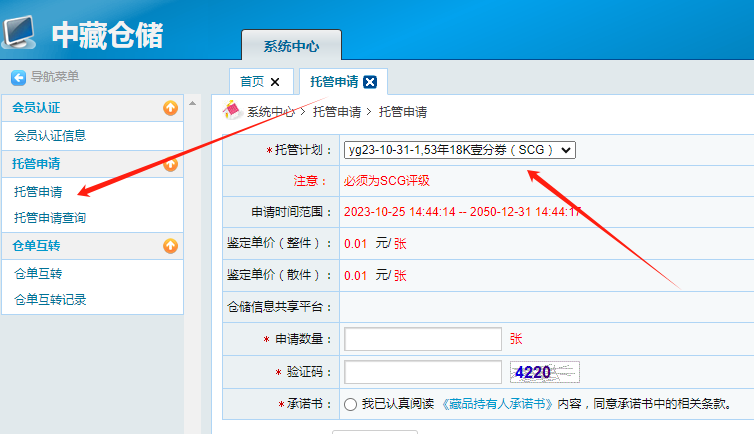 三、 点击“托管申请”,选择托管藏品、数量,点击确定: