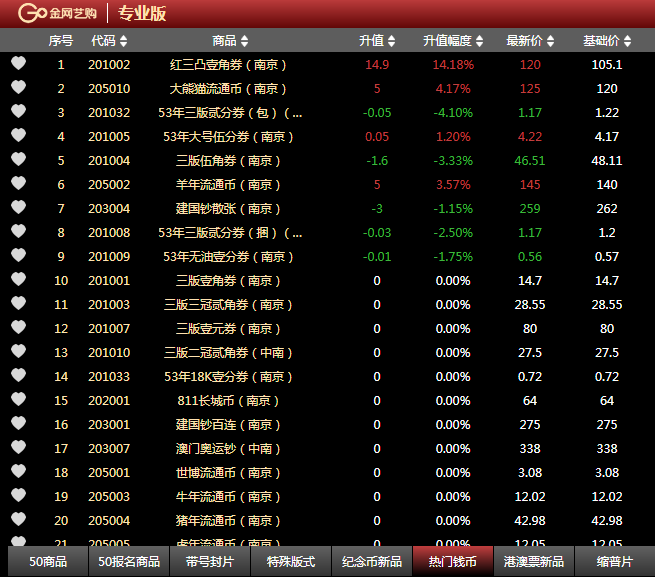 3、热门钱币板块:三版币整体震荡上行,红三凸大涨14%,收盘120元,买盘117元;三版壹角买盘14.7元;大熊猫流通币收盘125元,买盘110元。 |