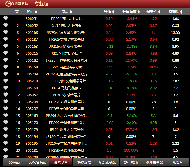 金网艺购商城今日(日盘)总销售量:1597290;总销售额:14650349.28。 1、带号封片版块:冬奥会徽片在阶段底部横盘整理,价格在19元附近;美丽乡村片在0.9元附近维持震荡,处于横盘整理;汤姆斯杯触底反弹后冲高回落,收于3.84元;不忘初心信卡小幅上涨,收盘4.98元。