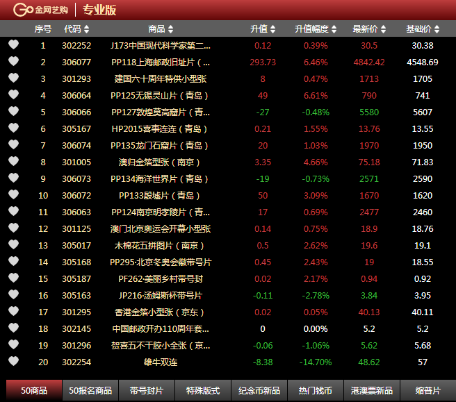 2、50商品板块:无锡灵山片横盘整理后向上突破,今日涨幅6.6%;邮政旧址片连续5日反弹,阶段涨幅超过50%;喜事连连、香港金箔小幅上涨;贺喜五在5.6元附近维持震荡。