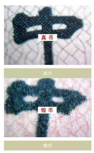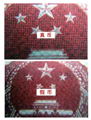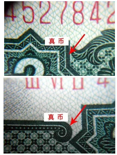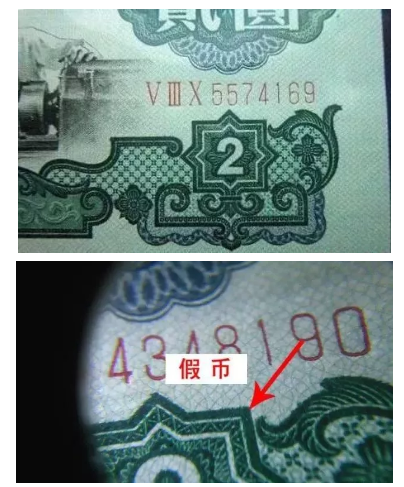 用三十倍放大镜观察1960版车工2元,如果是真币,在“中国人民银行”六个字上,都有像白色小气泡般的微小白色格子,而假币是做不到这点的,假币则会呈现出深绿色,没有微小白色格子。